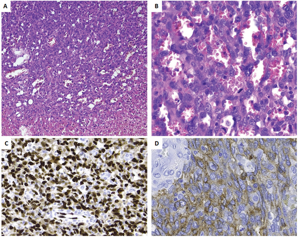 Figure 2: Histopathology and immunoprofile of the primary tumor. A. Low power view, showing the transition from viable tumor to necrotic tumor. Note the presence of vascular channels. B. At high power the vascular channels are delineated by plump cells with atypical nuclei. Numerous mitoses are seen (arrows). Tumor cells are strongly positive for ERG C. and weakly for CD117 D.