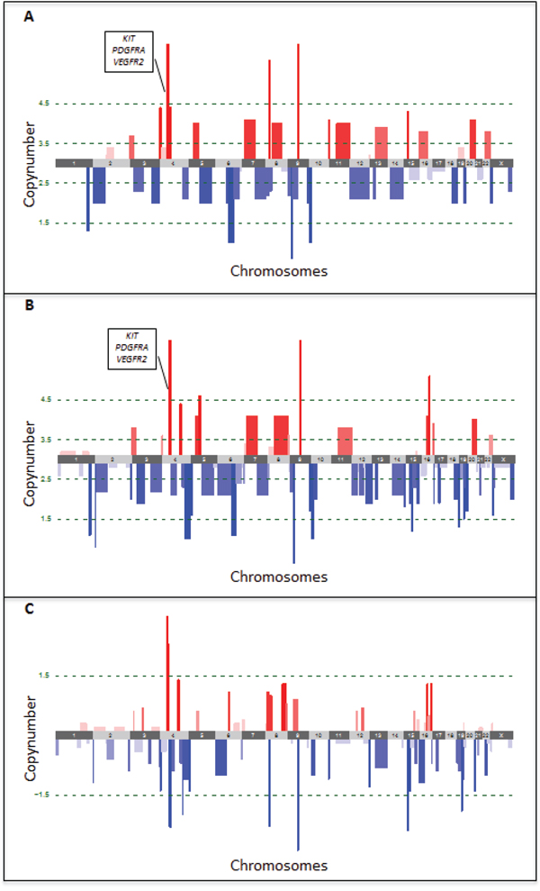 The comparison of copy number aberrations (CNAs) of the primary tumor lesion to the skin metastatic lesion that developed after progression on sunitinib was performed by low-read-depth whole-genome sequencing using DNA isolated from FFPE tissues. After segmentation with ASCAT, both primary and metastatic lesions were found to be triploid. Subsequently CNAs were classified in 5 categories based on their copy number (CN) (see methods). In the primary tumor, 3 high-level amplifications and 4 high-level deletions were detected (Figure 3A, Supplementary Table S1). Notably, one of the high level amplifications involved the 4q11-q13.1 region, which contains KIT, PDGFRA and VEGFR2. In the metastatic lesion, 4 high-level amplifications and 8 high-level deletions were detected (Figure 3B, Supplementary Table S1). Although we also identified 8 regions that had a difference in copy number greater than 1.5 copies when comparing primary and metastatic tumor cell populations (Figure 3C, Supplementary Table S1), the amplification of the 4q11-q13.1 region was sustained in both lesions. Notably, high-level amplification of either C-MYC/8q24 or FLT4/5q35 was not present in both lesions. A list of the 1435 genes occurring in the 19 regions with either high-level amplifications or deletions is available upon request.