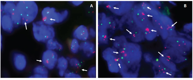 Figure 4: Representative examples of dual-color interphase FISH images on paraffin sections. A. Primary liver angiosarcoma, showing amplification of PDGFRA and KIT genes (which maps at 4q12) in 33% of cells (arrows), as detected by the co-hybridization of SpectrumOrange labeled BAC's PDGFRA/RP11–24O10 and KIT/RP11–959G16 DNA probes (red signals) and SpectrumGreen labeled chromosome 4 CEP probe (green signals). B. Skin metastases of relapsed tumor - using the same combination of probes, amplification of PDGFRA and KIT genes in reference to chromosome 4 CEP probe is detected in majority of cells (>80%).