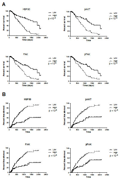 Figure 3: Survival duration (A) and time to transformation into overt leukemia (B) according to the levels of HSP90, pAKT, FAK and pFAK expression. Patients were separated into two categories: those with a high level of protein expression when the MFIR for this protein was equal to or above the median value of the entire cohort, or low level of protein expression when the MFIR was below the median value.