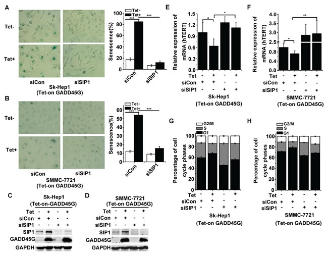 Figure 2: SIP1 inhibition attenuates GADD45G-induced tumor cell senescence in vitro. (A-B) Tet-on-GADD45G-Sk-Hep1 A. and Tet-on-GADD45G-SMMC-7721 cells (B) were transfected with siRNA targeting SIP1 (siSIP1) or with control siRNA ( siCon), then cultured for 3 days with or without GADD45G induction. Representative images of SA-β-gal staining (left panel) and the percentages of positive cells (right panel) are shown. Data shown are mean ± SD from three independent experiments (***P < 0.001). SD, standard deviation. (C-D) Tet-on-GADD45G-Sk-Hep1 (C) and Tet-on-GADD45G-SMMC-7721 cells (D) were transfected with the indicated siRNAs, then cultured for 3 days with or without GADD45G induction. The efficiency of the siRNA for the downregulation of SIP1 protein was confirmed by Western blot. (E-F) hTERT mRNA levels were measured in Tet-on-GADD45G-Sk-Hep1 (E) and Tet-on-GADD45G-SMMC-7721 (F) cells with the indicated treatments. Data shown are mean ± SD from three independent experiments (*P < 0.05, **P < 0.01). SD, standard deviation. (G-H) Tet-on-GADD45G-Sk-Hep1 (G) and Tet-on-GADD45G-SMMC-7721 cells (H) with the indicated treatments were harvested for analysis of the percentage of cells in each cell cycle phase by fluorescence-activated cell sorting. Data shown are mean ± SD from three independent experiments. SD, standard deviation.