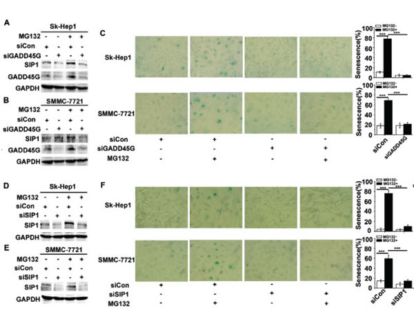 Figure 3: GADD45G and SIP1 are required for the proteasome inhibitor MG132-induced tumor cell senescence. (A-B) Sk-Hep1 (A) and SMMC-7721 (B) cells were transfected with siRNA targeting GADD45G or a control siRNA for 24 hours, then treated with or without 3 µM MG132 for 2 hours. Cells were harvested at 24 hours after MG132 treatment. Western blot analysis shows levels of SIP1 and GADD45G proteins. (C) Sk-Hep1 and SMMC-7721 cells were treated as indicated above. SA-β-gal staining analysis was performed for senescent cells. Data shown are mean ± SD from three independent experiments (***P < 0.001). SD, standard deviation. (D-E) Western blot analysis of SIP1 levels in Sk-Hep1 (D) and SMMC-7721 cells (E) which were transfected with the SIP1 siRNA or a control siRNA, then cultured for 24 hours with or without pretreatment of MG132. (F) Sk-Hep1 and SMMC-7721 cells were transfected with the indicated siRNAs, then cultured for 24 hours with or without pretreatment of MG132. Representative images showing SA-β-gal staining (left panel) and the percentage of positive cells (right panel) are shown. Data shown are mean ± SD from three independent experiments (***P < 0.001). SD, standard deviation].