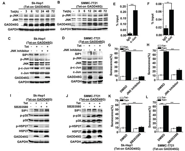 Figure 4: JNK but not p38 MAPK activation contributes to GADD45G-induced SIP1 upregulation. (A-B) Tet-on-GADD45G-Sk-Hep1 A. and Tet-on-SMMC-7721 cells B. were cultured with DOX for the indicated times. p-JNK levels were examined by Western blot. (C-D) Tet-on-GADD45G-Sk-Hep1 (C) and Tet-on-GADD45G-SMMC-7721 cells (D) were treated with 10µM JNK Inhibitor II for 1 hour, then cultured in the presence or absence of DOX for GADD45G induction for another 24 hours. Western blot analysis shows the levels of the indicated proteins. (E-F) Tet-on-GADD45G-Sk-Hep1 (E) and Tet-on-GADD45G-SMMC-7721 (F) cells were cultured for 48 hours with GADD45G induction, then the cells were cross-linked, sonicated and subjected to ChIP with anti-c-Jun antibody beads or agarose-conjugated anti mouse IgG beads. Isolated DNA was employed in qPCR with SIP1 promoter-specific primers. Data shown are mean ± SD from three independent experiments (**P < 0.01, ***P < 0.001). SD, standard deviation. (G-H) Tet-on-GADD45G-Sk-Hep1 (G) and Tet-on-GADD45G-SMMC-7721 (H) cells were treated with 10µM JNK Inhibitor II for 24 hours, then washed and cultured for 72 hours with or without GADD45G induction. The percentage of SA-β-gal positive cells is shown. Data shown are mean ± SD from three independent experiments (***P < 0.001). SD, standard deviation. (I-J) Tet-on-GADD45G-Sk-Hep1 (I) and Tet-on-GADD45G-SMMC-7721 cells (J) were treated with 10µM SB203580 for 24 hours with or without GADD45G induction. Western blot analysis shows the levels of the indicated proteins. (K-L) The SA-β-gal assay was performed in Tet-on-GADD45G-Sk-Hep1 (K) and Tet-on-GADD45G-SMMC-7721 cells (L) treated with 10µM SB203580 for 72 hours with or without GADD45G induction. The percentage of SA-β-gal positive cells is shown. Data shown are mean ± SD from three independent experiments (***P < 0.001). SD, standard deviation.