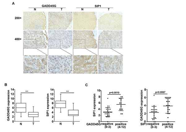 Figure 6: Expression levels of GADD45G and SIP1 were coincidently downregulated in human hepatocellular carcinoma. (A) Representative images of GADD45G and SIP1 immunohistochemical staining. Original magnification, ×200 (upper panel); ×400 (middle panel). (B) Box-and-whisker plots of the staining of GADD45G and SIP1. The immunoreactive score is shown as mean ± SD (***P < 0.001). SD, standard deviation. (C) Statistical analysis of SIP1 expression in HCC sections negative (score, 0-3) and positive (score, 4-12) for GADD45G staining (left panel; P = 0.0010). SIP1-negative HCC sections exhibited a significantly lower GADD45G staining (right panel; P = 0.0067). The immunoreactive score is shown as mean ±SD. SD, standard deviation.