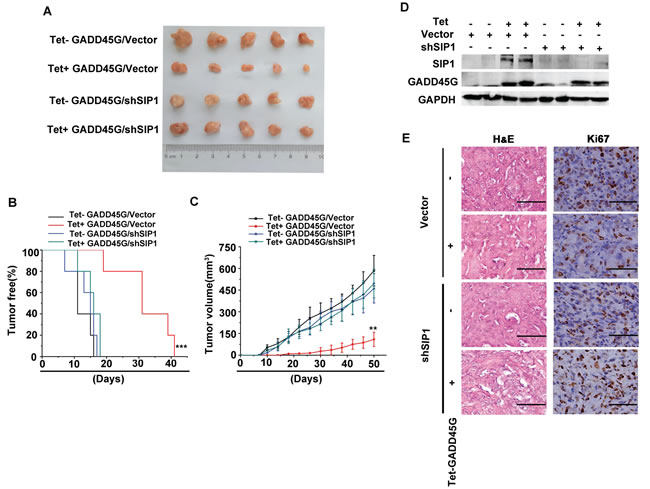 Figure 5: SIP1 inhibition attenuates GADD45G-mediated inhibition of tumor growth in vivo. (A) Tet-on-GADD45G-Sk-Hep1/Vector and Tet-on-GADD45G-Sk-Hep1/shSIP1 cells were injected subcutaneously into nude mice (n = 5 for each group), and the mice were received normal water (Tet-) or the drinking water with 2mg/mL DOX (Tet+) after cell injection. The photograph presents the growth of the tumors in the mice with or without a 50-day treatment of DOX for GADD45G induction. (B) Kaplan-Meier’s analysis of tumor onset. The group of Tet+ GADD45G/Vector mice compared with the control groups of mice (***P < 0.001). (C) Tumor volumes were measured at the indicated time intervals by measuring the maximum length and width of the tumor masses and were calculated by the following formula: V = length×(width)2/2 (**P < 0.01). (D) Successful induction of GADD45G and knockdown of SIP1 in the xenograft model were verified by Western blot. (E) Tumor sections from the mice were subjected to H&E staining and IHC against Ki-67. Original magnification, ×400. H&E, hematoxylin and eosin.