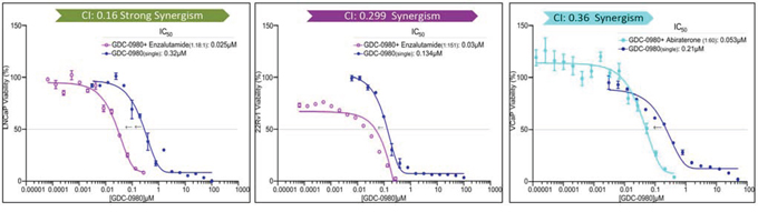 Figure 4: PI3K/mTOR inhibitor synergizes with AR inhibitor to decrease cell viability. LNCaP, 22Rv1 and VCaP cells were treated with PI3K/mTOR inhibitor, GDC-0980 plus AR signaling inhibitor, Enzalutamide for 4 days. The dose ratio was calculated for each combination based on the IC50 of single agents. MTS assays were carried out and the combination-index (CI) was calculated. Representative graphs were shown for the synergistic effect of each combination treatment.