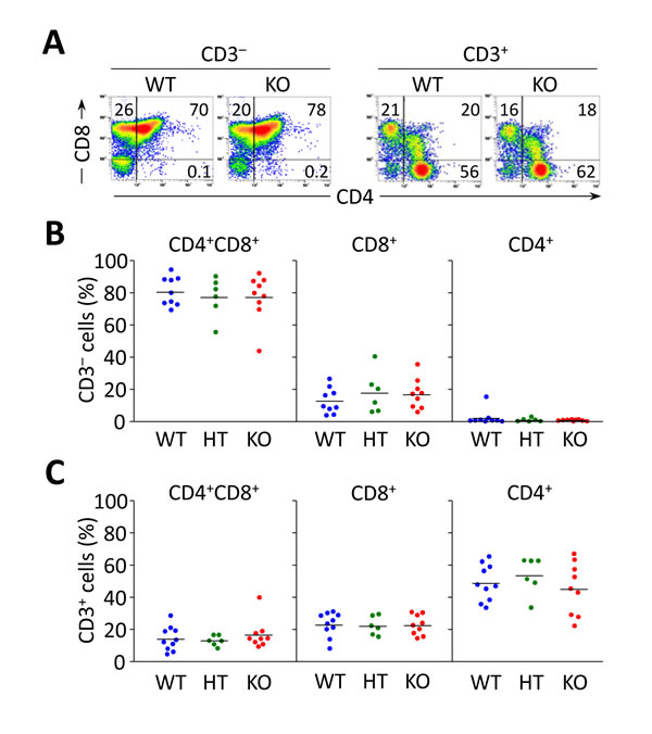 Figure 2: Flow cytometry analyses of thymocyte subsets in Ae2a,b−/− mice up to 10 months show no differences compared to littermate controls. A. Representative density plots showing the CD3− and CD3+ thymocyte subsets of WT, Ae2a,b+/− (HT), and Ae2a,b−/− (KO) mice. B. and C. Percentage of double-positive CD4+CD8+ and single positive CD4+ and CD8+ into CD3− (in B) and CD3+ populations (in C). Each dot represents the value for an individual mouse, and horizontal bars represent mean values.