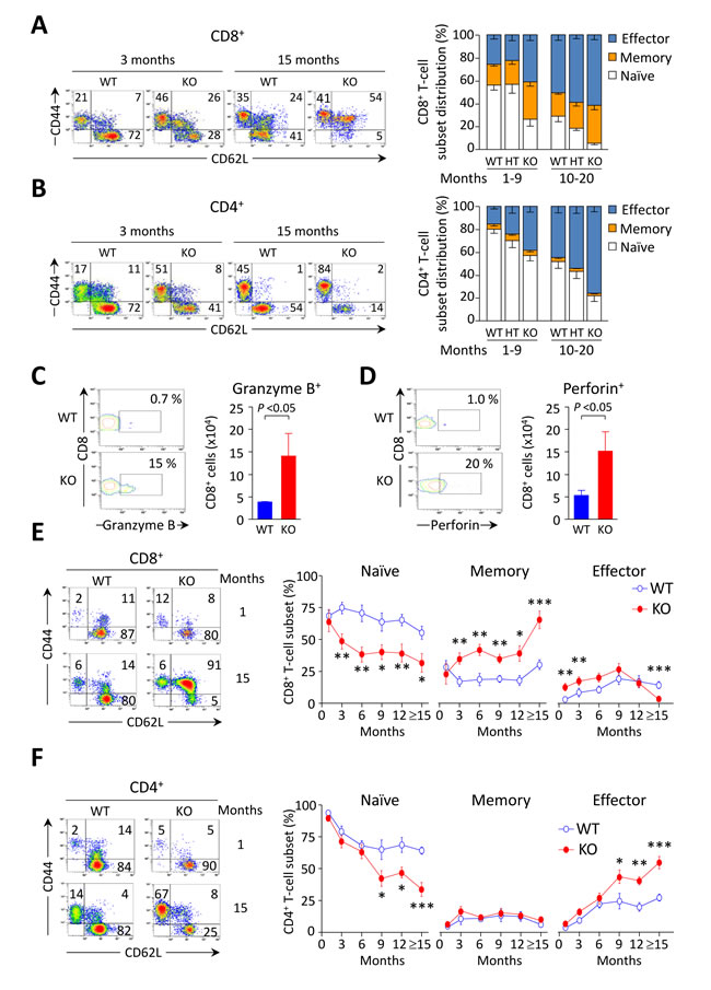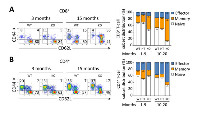 Figure 5: Activation status of T cells in the spleen of WT, HT, and Ae2a,b−/− mice analyzed by flow cytometry. A. and B. Representative density plots (left) and T-cell subset distributions (right), i.e. naïve (CD44loCD62Lhi), memory (CD44hiCD62Lhi) and effector (CD44hiCD62Llo) T cells, illustrating the activation status of CD8+ (in A) and CD4+ T splenocytes (in B) in both young and old mice. Data are shown as mean ± SEM of n = 8 mice per genotype and group.