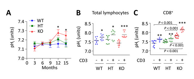 Figure 4: Intracellular alkalinization of PBLs in Ae2a,b−/− mice progresses over time and runs parallel with both expansion and activation of CD8+ T cells. A. Follow up of pHi in total lymphocytes isolated from peripheral blood of WT, HT, and Ae2a,b−/− mice at different ages. Results are shown as mean ± SEM of at least 10 mice per genotype and age. *P < 0.05 versus WT littermates. B. and C. pHi values of total lymphocytes (in B) and purified CD8+ T cells (in C) isolated from the spleen of young WT, HT, and Ae2a,b−/− mice and cultured in complete RPMI medium for 1 day in the presence or absence of anti-CD3 (1 µg/mL). Each dot represents the value for an individual mouse, and horizontal bars represent mean values. *P < 0.05, **P < 0.01, and ***P < 0.001 versus unstimulated conditions.