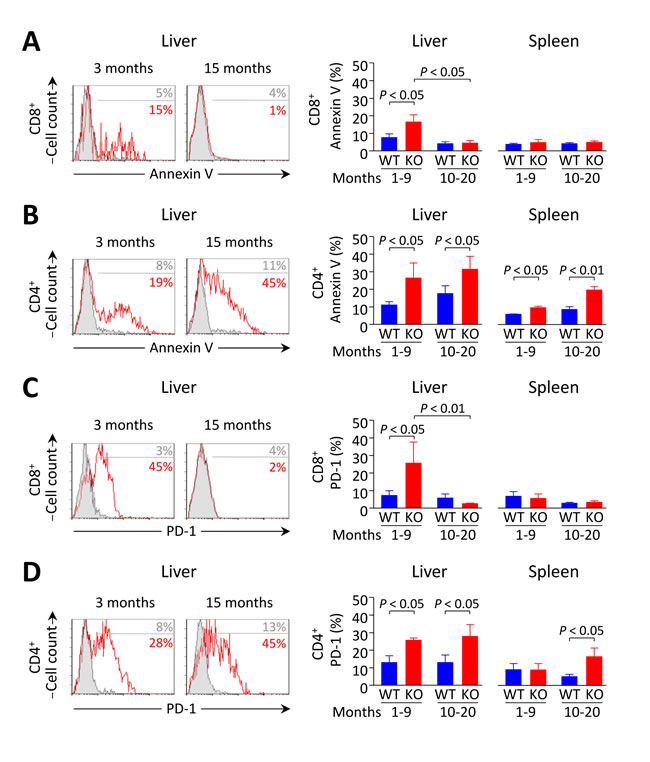 In the liver, terminal differentiation/activation of lymphocytes was reported to result in apoptotic cell deletion through PD-1/PD-L1 interaction [18]. We therefore hypothesized that the reduction in the number of intrahepatic T cells observed in young knockouts might be due to accelerated cell death within the liver. Indeed we found that the apoptotic rate of liver-infiltrating T cells (as manifested by annexin-V expression) was increased in young Ae2a,b−/− mice (Figure 6A, 6B), while a particularly diminished apoptotic rate occurred in intrahepatic CD8+ T cells of aged Ae2a,b−/− mice (Figure 6A). Notably, the percentage of PD-1+ intrahepatic CD8+ T cells was greatly increased in young knockouts while PD-1 expression decreased sharply in old Ae2a,b−/− mice (Figure 6C). In contrast to these age-related changes in annexin-V and PD-1 expression on intrahepatic CD8+ T cells, elevated frequencies of annexin-V+ and PD-1+ cells were found in intrahepatic CD4+ T cells of both young and aged Ae2a,b−/−mice (Figure 6B, 6D). On the other hand, CD8+ T cells never increased the expression of these molecules in both the spleen and peripheral blood regardless the genotype and the age of the animals (Figure 6 and Supplementary Figure S2).