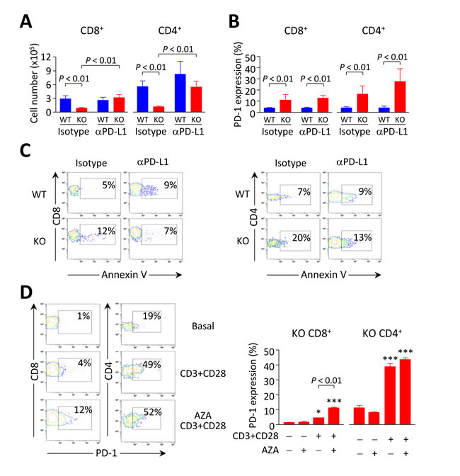 Figure 8: Breakdown of PD1/PD-L1 interaction contributes to accumulation of intrahepatic CD8+T cells in Ae2a,b−/− mice. A. and B. Cell number (in A) and PD-1 expression (in B) on liver-infiltrating CD8+ and CD4+ T lymphocytes from Ae2a,b−/− and WT mice intraperitoneally injected with anti-PD-L1 mAb (120 µg, five times every three days) and sacrificed at day 14. Isotype: rat IgG-isotype control. Data (in both A and B) are shown as mean ± SEM of n = 3 mice per genotype and group. C. Representative contour plots showing apoptotic rates (measured by annexin-V staining) of liver-infiltrating CD8+ (left) and CD4+ T cells (right). D. Representative contour plots (left) and percentages of PD-1 expression (right) on intrahepatic CD8+ and CD4+ T cells from aged Ae2a,b−/− mice upon stimulation with anti-CD3/CD28 Abs for three days in the presence or absence 1 µM 5-aza-2’-deoxycytidine. Data (mean ± SEM) are pooled from 2 independent experiments done in triplicates. *P < 0.05, and ***P < 0.001 versus unstimulated condition.