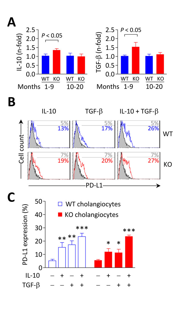 In association with these changes, the mRNA levels of the immunosuppressive cytokines IL-10 and TGF-β were upregulated in the liver of young Ae2a,b−/− mice but showed values similar to controls in aged knockouts (Figure 10A). Interestingly, IL-10 and TGF-β were found to upregulate PD-L1 on cultured mouse cholangiocytes (Figure 10B and 10C). Therefore, altogether our findings suggest that immunosuppressive mechanisms are induced in young Ae2a,b−/− mice as a homeostatic mechanism to dampen T-cell effector activation and that these control systems fail over time facilitating the development of autoimmune biliary disease at later periods of life.