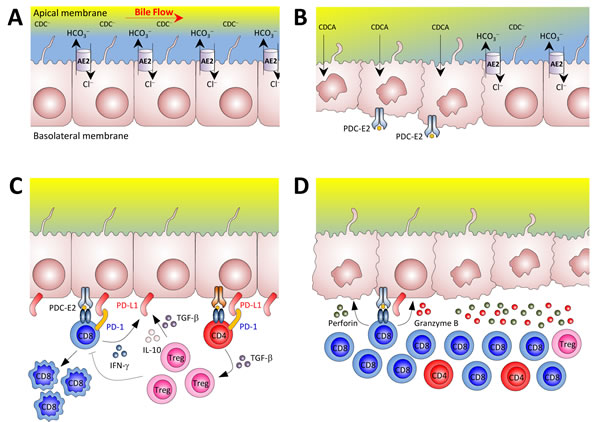 Figure 11: Potential mechanisms for the loss of tolerance against biliary epithelial cells in our mouse model of autoimmune cholangitis. A. Biliary epithelial cells use AE2 for biliary HCO3− secretion in order to develop a protective HCO3− umbrella [42]. Biliary HCO3− umbrella represents an alkaline environment around the luminal membrane of cholangiocytes, which prevents the protonation of hydrophobic bile salt monomers (e.g. chenodeoxycholic acid) -mainly conjugated with glycine in humans and with taurine in rodents- and renders them unable to permeate the cell membrane in an uncontrolled fashion, thus avoiding their toxic effects on cholangiocytes. B. In situations of AE2 deficiency (left side), apolar hydrophobic bile salts monomers may permeate the cell membrane of cholangiocytes and induce apoptosis. During the apoptosis process, the PDC-E2 epitope can remain intact because of the strong reduction capability of the cholangiocyte cytosol which limits adequate glutathionylation of the lipoyl moiety [43]. In a context of a “hyper-responsive” immune system, non-glutathionylated PDC-E2 peptides may promote the development of PDC-E2 specific AMA as a side-phenomenon of cholangiocyte injury. PDC-E2 epitope from the apoptotic cholangiocytes can then be recognized by circulating AMA and/or be presented by the innate immune system, further activating the adaptive immune response [44, 45]. C. Cholangiocytes can express different molecules linked to antigen presenting cell function [17, 46], and in PBC these cells are the direct target of the immune system. In our animal model of autoimmune cholangitis, T cells were found to be activated and deleted in the liver at early ages. Cytokines like IFN-γ, TGF-β, and IL-10 may upregulate PD-L1 expression on biliary epithelial cells which in the context of an adequate number of functional Treg cells can control self-reactive T cells. D. In the elderly, however, the reduced number of Tregs in the liver and PD-1 silencing in CD8+ T cells can make cholangiocytes more susceptible to immune attack by cytotoxic CD8+ T cells. Abbreviations: AE2, anion exchanger 2; CDC−; polar chenodeoxycholate; CDCA, apolar chenodeoxycholic acid; PD-1, programmed death-1; PDC-E2, E2 component of the pyruvate dehydrogenase complex.