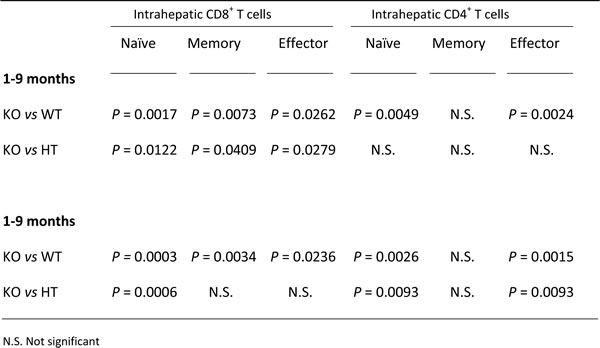 Table 1: P values for differences between liver-infiltrating T-lymphocyte subsets in Ae2a,b−/− and WT mice at different ages