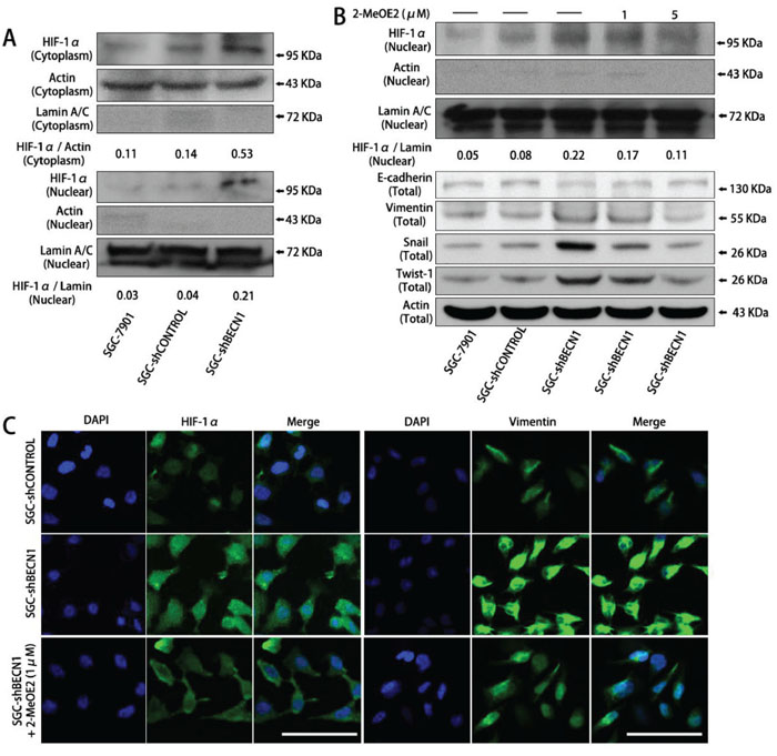 Figure 2: The EMT induced by autophagy inhibition is dependent on HIF-1α activation in gastric cancer cells. A. In normoxia, HIF-1α expression in cytoplasm and nucleus of SGC-shBECN1 and control cells were analyzed by Western blot. The density ratio of HIF-1α / Actin in cytoplasm and HIF-1α / Lamin in nucleus were calculated to quantify the Western blot signals. B & C. After pretreatment with 1 or 5 μM 2-MeOE2 for 48 h, nuclear translocation of HIF-1α and expression of EMT markers in SGC-shBECN1 cells were determined by Western blot analysis or immunofluorescence analysis respectively. Scale bar, 100 μm.