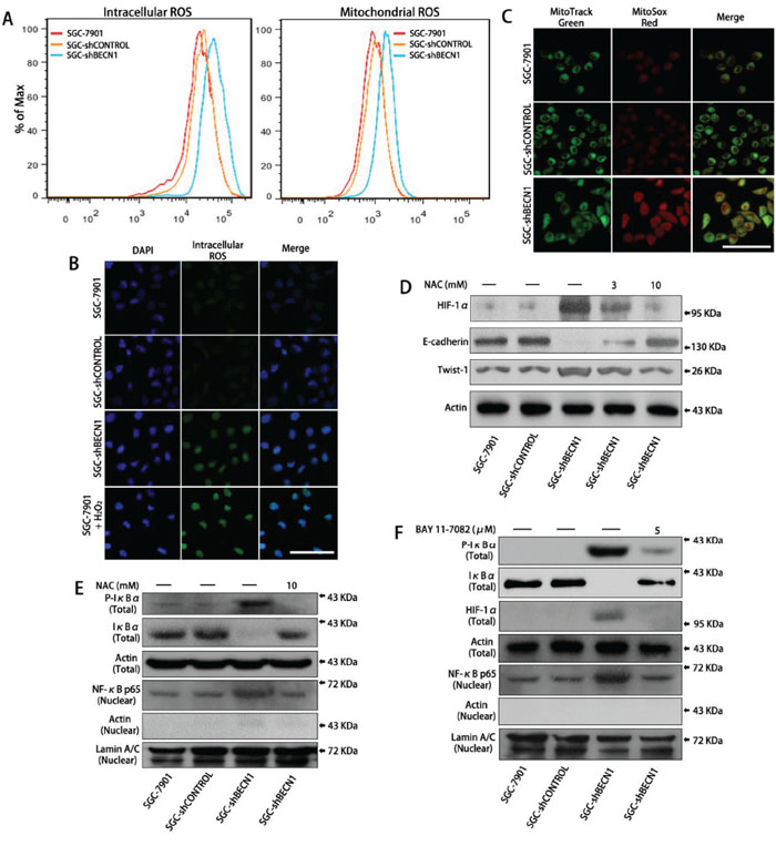 Figure 3: Autophagy defect in gastric cancer cells facilitates HIF-1α expression by ROS-NF-κB-HIF-1α pathway. A. Intracellular ROS level was determined after pretreatment with DCF-DA (left panel) and mitochondrial ROS level was determined after pretreatment with MitoSox Red (right panel) by flow cytometry (FCM) analysis respectively. B & C. Intracellular and mitochondrial ROS levels were observed by a fluorescence confocal microscope. Scale bar, 100 μm. D. SGC-shBECN1 cells were treated with 3 or 10 mM NAC for 48 h, then the expression of HIF-1α and EMT markers were determined by Western blot. E. After incubation with or without 10 mM NAC for 48 h, the expression of Phospho-IκBα and IκBα in whole cells and the expression of NF-κB p65 in nuclei were analyzed by Western blot. F. After pretreatment with or without 5 μM BAY 11–7082 for 24 h, the expression of Phospho-IκBα, IκBα, HIF-1α in whole cells, and the expression of NF-κB p65 in nuclei were determined by Western blot.