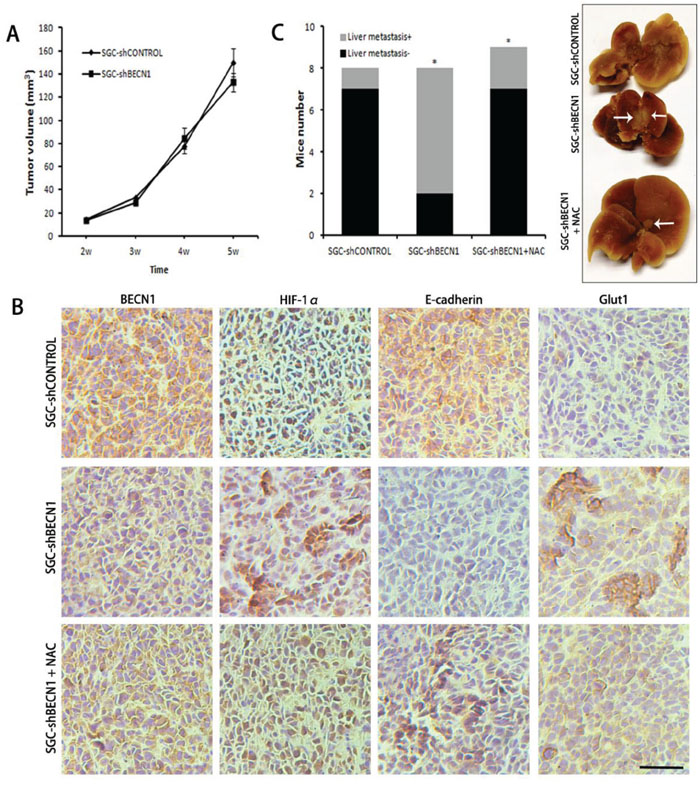 Figure 6: Antioxidant NAC reverts autophagy inhibition induced metastasis in vivo. A. The subcutaneous tumors were established in nude mice by implanting SGC-shCONTROL and SGC-shBECN1 cells. Tumor masses of all mice were measured twice a week and tumor volume was calculated. B. The expression of BECN1, HIF-1α, E-cadherin and Glut1 in xenografts from SGC-shCONTROL, SGC-shBECN1 and SGC-shBECN1 + NAC groups were determined by Immunohistochemical analysis. Scale bar, 100 μm. C. Liver metastatic mice models were induced by splenic inoculation of SGC-shCONTROL and SGC-shBECN1 cells. The liver metastatic mice of three groups were counted respectively. The white arrows pointed to metastatic nodules in livers. Bars represent mean ± SD. *: P < 0.05.