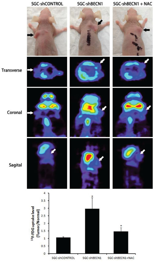 Figure 7: Antioxidant NAC restrains autophagy inhibition induced glycolysis in vivo. The glucose uptake in subcutaneous xenografts from SGC-shCONTROL, SGC-shBECN1 and SGC-shBECN1 + NAC groups were detected by microPET using 18F-FDG. 18F-FDG uptake values in xenografts were calculated using the formula: Tumor / Normal ratio = pixel maximum uptake in tumor / pixel mean uptake in upper limb muscles. The black and white arrows pointed to subcutaneous xenografts. Bars represent mean ± SD. *: P < 0.05.