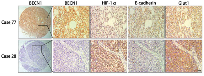 Figure 8: Immunohistochemical analysis of consecutive sections from human gastric cancer tissues. First row, the expression of HIF-1α, E-cadherin and Glut1 in positive BECN1 expression case (case 77). Second row, the expression of HIF-1α, E-cadherin and Glut1 in negative BECN1 expression case (case 28). Scale bar, 100 μm.