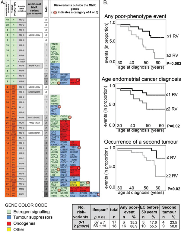 The distribution of MMR pathogenic mutations did not vary between women with poor and neutral clinical phenotypes (Table 3), but patients with poor clinical phenotypes carried more frequently one or more risk-variants outside the MMR genes compared with women with a neutral phenotype (Table 3 and Figure 1A).