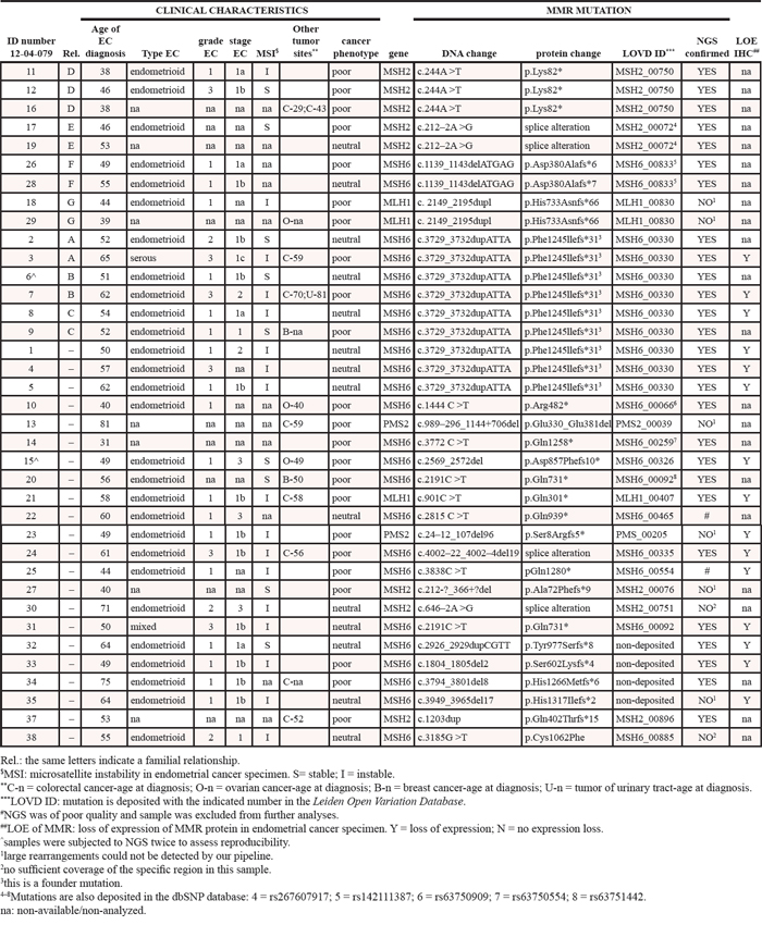 Thirty-seven Dutch Caucasian women from 29 families who developed hereditary endometrial cancer and carried a germ-line mismatch repair (MMR) gene mutation were enrolled (Table 1). Women were counseled at the Maastricht or Leiden Medical Centers (2011–2013) because of a Lynch syndrome family history, a Lynch syndrome mutation or a Lynch Syndrome diagnosis (Bethesda criteria). Genomic DNA was used for Next Generation Sequencing (NGS) analyses. All women had given consent to use their DNA for research. The local medical ethical committee approved the protocol (METC 12–04-079).