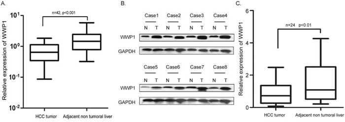 Figure 1: Expression of WWP1 mRNA and protein in human primary HCC surgical specimens as evaluated by real-time quantitative PCR and western blot. A. Relative mRNA expression of WWP1 was higher in 42 HCC tissues than in matched adjacent non-cancerous tissues (P < 0.01). B. Representative result of expression of WWP1 protein in eight paired HCC tissues and matched adjacent non-cancerous tissues (T, HCC tissues; N, matched non-cancerous tissues). C. Relative expression of WWP1 protein was increased remarkably in 24 HCC tissues than in matched adjacent non-cancerous tissues (P < 0.01).
