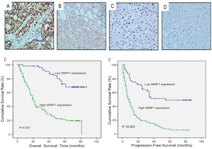Figure 2: Immunohistochemical analyses of WWP1 protein expression in primary hepatocellular carcinoma surgical specimens and Kaplan–Meier survival analyses of the primary HCC patients (n = 149) with high WWP1 expression (n = 95) and low WWP1 expression (n = 54) after resection. A. Strong WWP1 staining was observed in poorly differentiated HCC, scored as WWP1 (+++). B. Intermediate WWP1 staining in moderately differentiated HCC, scored as WWP1 (++). C. Weak WWP1 staining in poorly differentiated HCC, scored as WWP1 (+). D. WWP1-negative staining in normal liver tissue distant from the tumor, scored as WWP1 (–). E–F. Based on their WWP1 immunostaining scores, HCC patients were divided into low-WWP1 expression (WWP1− or WWP1+) and high-WWP1 expression (WWP1++ or WWP1+++) groups. Overall survival (E) and Progression-Free-Survival (F) of patients in the high-WWP1 group was significantly lower than that of patients in the low-WWP1 group (P < 0.001 for the log-rank test).