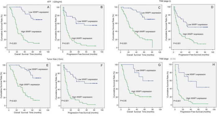 These observations were further confirmed by stratified OS and PFS analyses: OS and PFS in patients with high expression of WWP1 were found to be dependent on AFP concentration (Figure 3A and 3B), TNM stage (Figure 3C–3D and 3G–3H) and tumor size (Figure 3E and 3F). The threshold levels were set at AFP ≤ 25 ng/ml, TNM stage: I vs. stage II–II and tumor size < 3 cm.