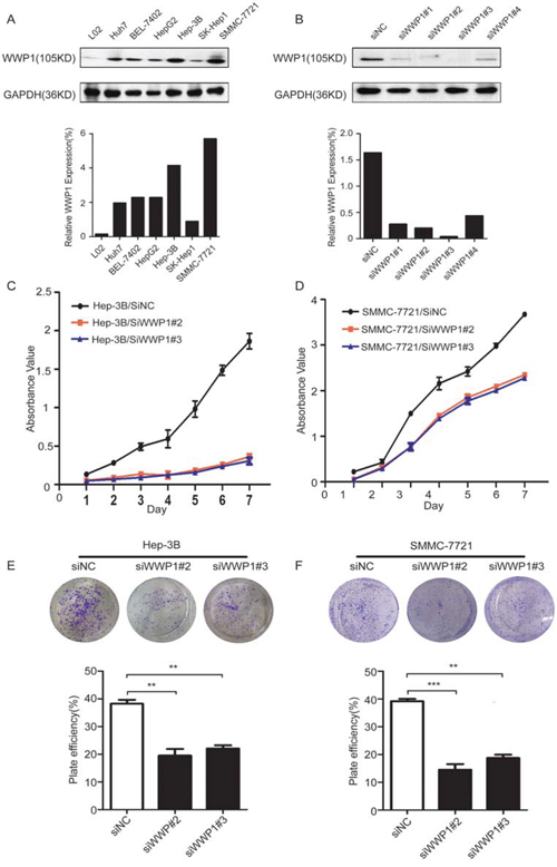 Figure 4: Expression of WWP1 protein in human HCC cell lines and the efficiency of WWP1-targeting siRNAs in Hep-3B and SMMC-7721 cell lines. And growth-promoter role of WWP1 in cell proliferation and colony-formation assays of Hep-3B and SMMC-7721 cell lines. A. WWP1 protein was upregulated in Huh7, BEL-7402, HepG2, Hep3B, SK-hep1 and SMMC-7721 cells (particularly in Hep-3B and SMMC-7721 cells) compared with the normal liver cell line LO2. B. siWWP12# and siWWP1#3 had the highest knockdown efficiency of the four tested siRNAs. C, D. Cell-proliferation assay showing the suppressive effect of knocking down WWP1 expression in vitro proliferation of Hep-3B (A) and SMMC-7721 (B) cell lines. Experiments were done in triplicate. E and F. Representative inhibition of colony formation in a monolayer culture by inhibition of WWP1. Bottom, quantitative analyses of foci numbers are shown as the mean ± standard deviation. Experiments were carried out in triplicate. P-values were calculated using the Student’s t-test. **P < 0.01 versus control; ***P < 0.001 versus control.