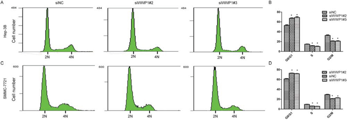 Figure 6: Depletion of WWP1 induces G1/S arrest of HCC cells. Flow cytometry analysis of the indicated Hep-3B A, B. cells and SMMC-7721 C, D. transfected WWP1-specific siRNA(s). The proportion of S-phase cells as significantly reduced in WWP2 sIRNA(s)-transfected cell lines (P < 0.05) compared with the control group; in contrast, the proportion of S-phase and G2/M cells in the line transfected with the WWP1 construct clearly increased (C, D). (P < 0.05) *P < 0.05