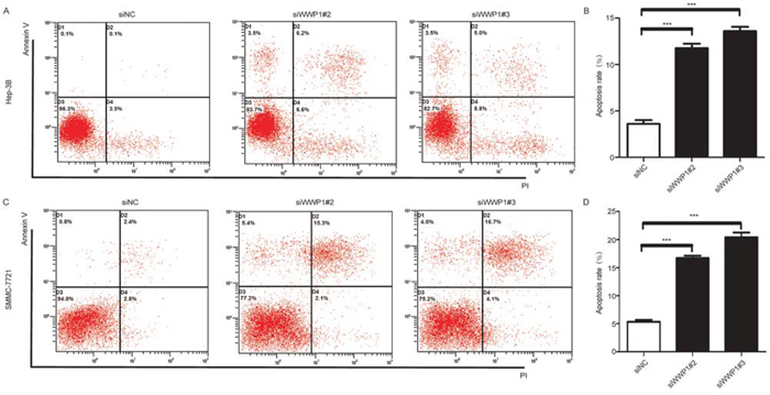 In order to examine how a deficiency in WWP1 might affect cell growth in HCC cell lines, flow-cytometric analysis with annexin V-FITC and PI was carried out in Hep-3B and SMMC-7721cells. The results showed that the percentages of apoptotic cells in the Hep-3B cells 72 h post-transfection with siWWP1#2 and siWWP1#3 increased by 9.5% and 10.3%, respectively, compared to those in negative (siNC) control cells (Figure 7A and 7B). Similar results were observed in SMMC-7721 cells, with percentage differences of 12.5% and 14.5%, respectively (Figure 7C and 7D).
