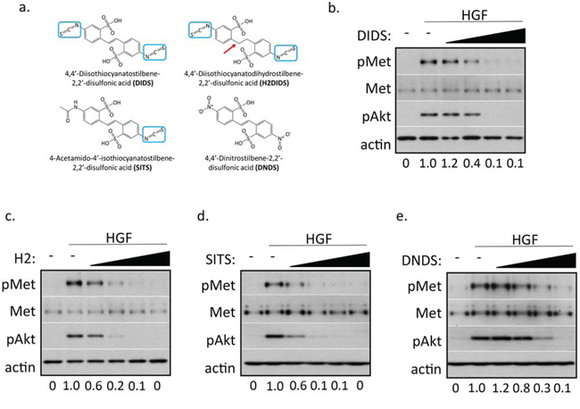 Figure 1: Stilbene analogs reduce c-Met activation in a dose-dependent manner. a. Chemical structures of the investigated stilbene analogs. All compounds share the same stilbene core, except H2DIDS which is lacking a double bond linker of both aryl groups, indicated by a red arrow. Three of the four compounds contain at least one p-isothiocyanate group, indicated by blue boxes. b–e. DU145 cells were treated with 33 ng/ml HGF for 20 minutes in the presence of 500 nM, 2 μM, 8 μM, 32 μM DIDS (b) or H2DIDS (c), 125 μM, 250 μM, 500 μM, 1 mM SITS (d), or 250 μM, 500 μM, 1 mM, 2 mM DNDS (e). Western blot was used to analyze the indicated proteins. Densitometry shows changes in pMet compared to HGF control normalized to 1.