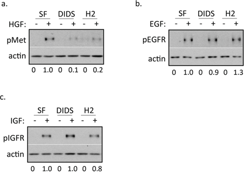 To begin to assess the specificity of DIDS and H2DIDS, we treated DU145 cells with concentrations of DIDS and H2DIDS known to inhibit c-Met activation in combination with HGF, epidermal growth factor (EGF), or insulin-like growth factor (IGF). Western blot analysis revealed that concentrations of DIDS and H2DIDS that reduce c-Met activation do not significantly reduce EGFR or IGFR activation (Figure 2a–2c), suggesting some degree of selectivity for c-Met.