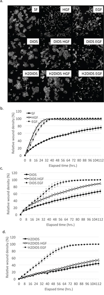 Figure 3: DIDS and H2DIDS reduce HGF-induced but not EGF-induced cell scattering and wound healing. a. DU145 cells were treated with 33 ng/ml HGF or 100 ng/ml EGF overnight in the presence of 4 μM DIDS or 25 μM H2DIDS. Cells were fixed and stained for actin. Representative images are shown. b–d. Confluent monolayers of DU145 cells were wounded prior to treatment with 33 ng/ml HGF or 100 ng/ml EGF for the indicated times in the presence of 4 μM DIDS or 25 μM H2DIDS. Data are shown as mean ± S.E.M; n = 3.