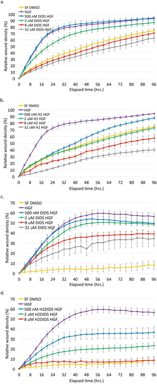 We next sought to determine the effect of these compounds on HGF-mediated phenotypes. DU145 cells exhibit a striking scattered and motile phenotype in response to EGF and HGF stimulation indicative of an epithelial-mesenchymal transition. An initial dose response scattering assay revealed that DIDS inhibited HGF-induced scattering between 1.8 μM and 8 μM and H2DIDS was effective between 8 μM and 40 μM (Figure S3). Using concentrations of DIDS and H2DIDS within this range, we discovered that these same concentrations were able to reduce HGF-induced, but not EGF-induced cell scattering (Figure 3a). This was consistent with our observations that DIDS and H2DIDS do not inhibit EGFR signaling (Figure 2b). Similarly, HGF-induced wound healing, a unique collective form of cell motility, was also significantly reduced while the same concentrations had minimal effects on EGF-mediated wound healing (Figure 3b–3d). We further examined dose response effects of DIDS and H2DIDS on c-Met phenotypes. Figure 4a and 4b show that DIDS and H2DIDS reduce HGF-induced wound healing in a dose response manner.