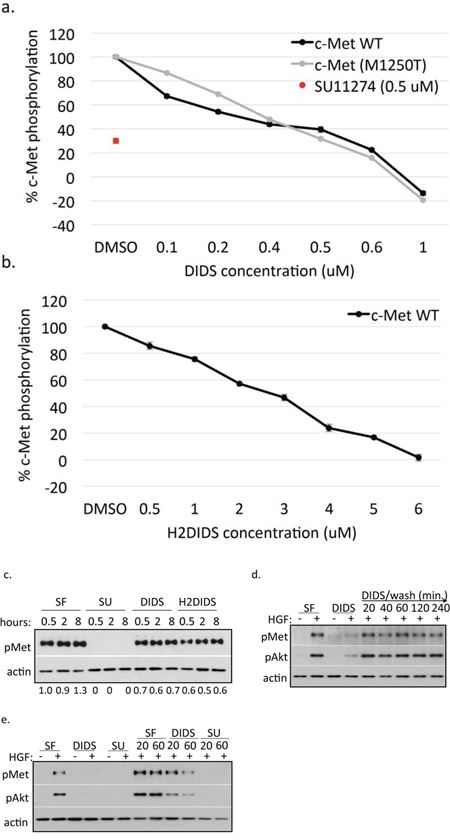 It has been reported in the literature that DIDS can exhibit covalent crosslinking properties [22, 23]. To determine if this could account for c-Met inhibition, we treated DU145 cells with DIDS followed by one wash step and up to 1 hour recovery time prior to activation with HGF. Even as early as 20 minutes post-wash, HGF was able to activate c-Met to non-DIDS treated levels (Figure 6d) suggesting DIDS does not irreversibly bind c-Met. Surprisingly, we found that DIDS treatment post HGF treatment reduced pMet levels suggesting that DIDS is able to reverse c-Met activation under certain conditions (Figure 6e). This has also been observed with SU11274 previously [24] and is further supported by our data (Figure 6d).