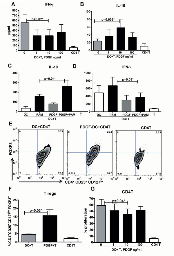 Figure 2: PDGF-DC induces T regulatory cells. PDGF-DC and unstimulated DC were cultured with CD4T cells for 5 days. Bar graphs depict the levels of A. IL-10 and B. IFN-γ secreted by T cells. Data is mean +/- S.E. of 5 different subjects. PDGF-DC, PAM-stimulated DCs, PDGF-PAM DCs and unstimulated DC were cultured with CD4T cells for 5 days. Bar graphs depict the levels of C. IL-10 and D. IFN-γ secreted by T cells. Data is mean +/- S.E. of 4 different subjects. E. Zebra plot depicts the percentage of FoxP3+ cells in gated CD4+CD25+CD127lo cells in DC-T cell coculture. Figure is representative of 4 such experiments. F. Bar graph depicts the mean +/- S.E. of the same. E. Bar graph depicts the percent of T cell proliferation as measured by CFSE dye dilution. Data is mean +/- S.E. of 6 different subjects.
