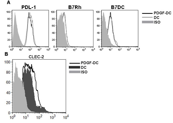 Control and PDGF-stimulated DCs (PDGF-DC) were analyzed for the expression of CD40, CD80, CD86, CD83, PDL-1, B7DC, B7Rh and HLADR (BD Bioscience) using Flow jo (Treestar Inc).