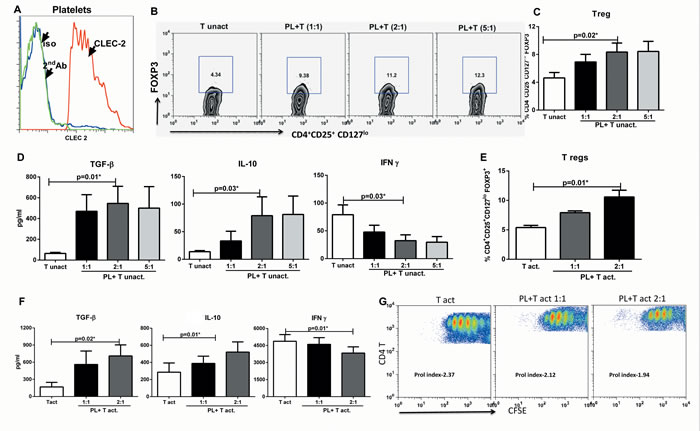 Figure 5: CLEC-2 expression on platelets induces T regulatory cells. Platelets were cultured with T cells for 96h. A. Histogram depicts the expression of CLEC-2 on freshly isolated platelets. B. Zebra plot depicts the percentage of FoxP3+ cells in gated CD4+CD25+CD127loFoxP3+ cells in PL-CD4+T (unactivated) cell coculture. Figure is representative of 5 such experiments. C. Bar graph depicts the mean +/- S.E. of the same. D. Bar graphs depict the production of TGF-β, IL-10 and IFN-γ in the co-culture. Data is mean +/- S.E. of 5 different subjects. E. Bar graph depicts the percentage of FoxP3+ cells in gated CD4+CD25+CD127loFoxP3+ cells in PL-T (anti CD3+anti- CD28 activated) cell coculture. F. Bar graphs depict the production of TGF-β, IL-10 and IFN-γ in the co-culture. Data is mean +/- S.E. of 5 different subjects. G. Dot plots depict the T cell proliferation in PL- T (act) coculture as measured by CFSE dye dilution. Prol index is proliferation index. Figure is representative of 4 such experiments.