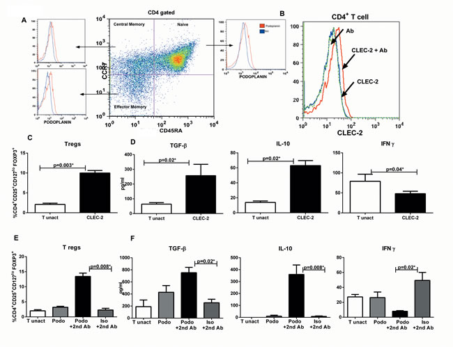 Figure 6: Addition of CLEC-2 protein/podoplanin antibody to T cells induces T regulatory cells. A. Histograms depict the expression of Podoplanin of on naïve, central memory and effector memory CD4 T cells. Figure is representative of 3 such experiments. B. Histogram depicts the binding of CLEC-2 protein on freshly isolated CD4 T cells. Figure is representative of 3 such experiments. Purified T cells were cultured with CLEC-2 protein for 96h. C. Bar graph depicts the percentage of FoxP3+ cells in gated CD4+CD25+CD127loFoxP3+ cells in CD4+T cells cultured with CLEC-2. D. Bar graphs depict the production of TGF-β, IL-10 and IFN-γ by T cells cultured in the presence of CLEC-2 protein. Data is mean +/- S.E. of 4 different subjects. Purified T cells were cultured with either podoplanin antibod (podo) or podo+2nd antibody or isotype antibody (iso) + 2nd antibody for 96h. C. Bar graph depicts the percentage of FoxP3+ cells in gated CD4+CD25+CD127loFoxP3+ cells. D. Bar graphs depict the production of TGF-β, IL-10 and IFN-γ by T cells. Data is mean +/- S.E. of 4 different subjects.