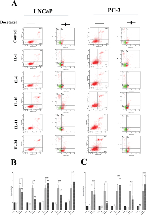 Figure 4: Docetaxel treatment sensitivity influence. A. shows representative flowcytometry figures for LNCaP and PC-3 cell lines treated with different ILs with and without docetaxel application. Corresponding histogram results are shown in B. and C. for LNCaP and PC-3 cells, respectively. While docetaxel significantly induces apoptosis in both cell lines, application of either IL-3, or IL-6 or IL-11 slightly inhibits the apoptosis in the both cell lines. On the contrary, application of either IL-10 or IL-24 slightly increases the apoptosis already induced by the docetaxel. * means p < 0.05, ** means p < 0.01, and *** means p < 0.001, in comparison to the control groups, respectively.