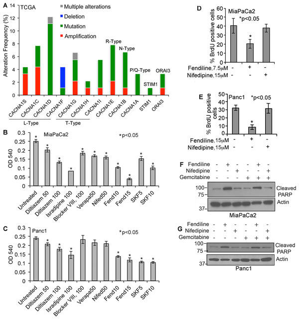 Figure 1: Human PDACs show alterations in voltage-gated and store operated calcium channel expression and calcium channel inhibitors induce cytotoxicity in pancreatic cancer cells: A. Bargraph generated using the data obtained from TCGA portal shows that human PDAC samples show alterations in calcium channels. The alteration frequency in L-type, T-type, R-type, N-type and P/Q-type calcium channel subunits or ORAI3 and STIM1 are shown. B. & C. MiaPaCa2 and Panc1 pancreatic cancer cells treated with various calcium channel blockers show reduced viability. The experiments were repeated 3 times in quadruplicate and the data shows mean ± SE, *p < 0.05. D. and E. Fendiline inhibits proliferation of Panc1 and MiaPaCa2 pancreatic cancer cells: Cells were incubated with fendiline (7.5 or 15 µM) or nifedipine (15µM) for 24h and BrdU incorporation was analyzed. Experiments were repeated thrice, 100 cells were counted from 3 different areas on the slides, and the percent of cells showing BrdU positivity was calculated and plotted (mean ± SE), *p < 0.05. F. and G. Fendiline induces apoptosis in pancreatic cancer cells: Cell lysates from MiaPaCa2 and Panc1 cells treated with or without fendiline, nifedipine or gemcitabine alone or in combination were western blotted using cleaved PARP antibody. Membranes were reprobed with actin antibody for protein normalization.