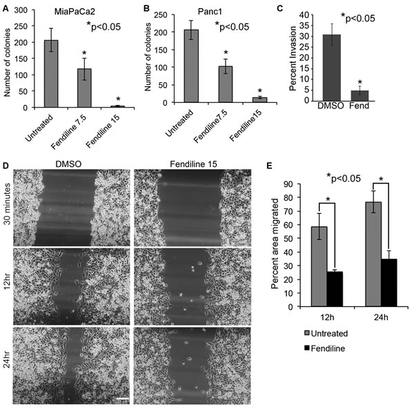 Figure 3: Fendiline inhibits anchorage-independent growth, migration and invasion of cancer cells: 5,000 MiPaCa2 A. or Panc1 B. cells were seeded in 0.3 % agar containing medium and layered on top of 0.6% base agar layer in 12 well plates. Colonies were allowed to grow in the presence or absence of 7.5 and 15 µM fendiline for 2.5 weeks and stained with MTT. Quantification was performed using ImageJ image analysis tool and the number of colonies within a defined area is counted and plotted. Each treatment was performed in triplicates and each experiment was repeated thrice (*p < 0.05). C. Boyden chamber analysis show reduced invasion of Panc1 cancer cells upon treatment with 15µM fendiline (Fend), *p < 0.05. E. Fendiline inhibits migration of cancer cells: Panc1 cells grown to confluence in a 12 well dish was growth arrested by serum starvation for 24h and scratch wounds were made. Images of treated and untreated wells were taken within 30min. after the wounds were made and at 12h and 24h periods. E. The cell-free area of the wound was measured and percent area covered by cells was calculated based on the initial wound area measured within 30min. Experiment was done in triplicate and repeated thrice and the bargraph shows that cell migration is significantly reduced by fendiline treatment at 12 and 24h (mean ± SD).
