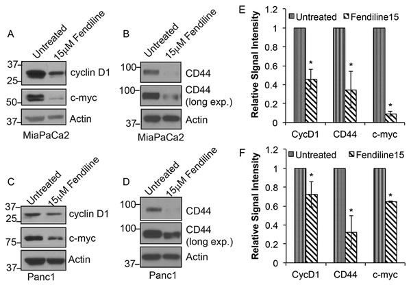 Figure 5: Fendiline inhibits expression of c-Myc, cyclin D1 and Cd44: MiaPaCa2 A. and B. and Panc1 C. and D. cells were treated with or without 15µM fendiline and analyzed by western blotting for cyclin D1, c-Myc and CD44 expression levels. Actin was used as loading control in each case. E. and F. Blots from 3 independent experiments using MiaPaCa2 E. or Panc1 F. cells were scanned and quantified using Image J Image analysis tool and normalized to actin levels prior to plotting, *p < 0.05.