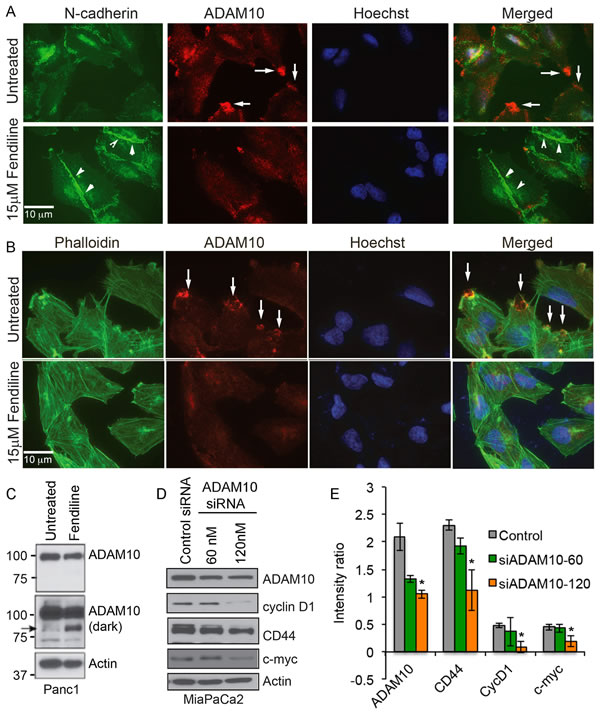 Figure 6: Fendiline treated Panc1 cells show reduced localization of ADAM10 at the membrane protrusions: Panc1 cells were treated with or without 15µM fendiline and stained with ADAM10 and N-cadherin A. or ADAM10 and Alexa Fluor 488-phalloidin B.. Untreated cells show strong localization of ADAM10 at the membrane protrusions, as indicated by arrows in A. and B. and the arrowheads in A. show strong staining for N-cadherin at the cell-cell adherens junctions. Magnification: 63X. C. Panc1 cells treated with fendiline show a reduction in the ADAM10 levels and formation of the ~85kDa fragment, indicated by arrow. D. and E. ADAM10 knockdown in MiaPaCa2 cells leads to downregulation of cyclin D1, CD44 and c-Myc. Blots from two independent experiments were scanned and used for quantification.