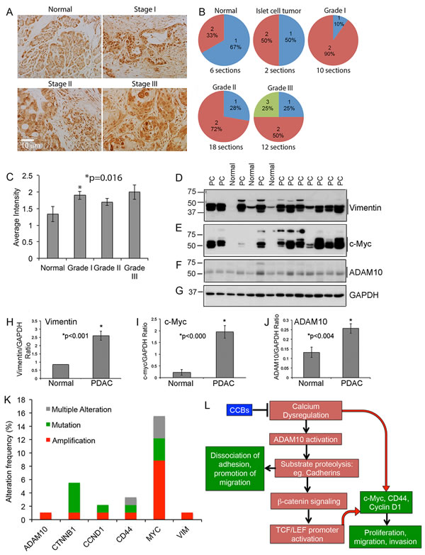 Figure 8: PDAC tumor tissue array show enhanced expression of ADAM10: A.-C. Tumor tissue array containing normal, islet cell tumor and Grade I, II and III PDAC tissue samples were immunostained using an ADAM10 antibody A. and intensity of the stained sections were measured by Dr. Coppola, Senior Pathologist at Moffitt Cancer Center. The stain was semiquantitatively scored based on the intensity of the stain as negative (0), weak (1), moderate (2) and strong (3). In all cases at least 34% of the tumor was positive, which is shown in B. The bargraph in C. shows that ADAM10 levels are increased in tumor tissues, with Grade 1 tumors showing a significant increase. D.-J. Expression of vimentin, c-Myc and ADAM10 are significantly increased in PDAC: PDAC tissue samples and samples from normal pancreas were analyzed by western blot using vimentin (D. and H.), c-Myc (E. and I.) and ADAM10 (F. and J.) antibodies and blots were reprobed with GAPDH antibody for normalization of proteins. K. Graph plotted using the data derived from TCGA portal show that PDAC human samples show increased alterations, especially amplification and/or mutation, in ADAM10, β-catenin (CTNNB1), cyclin D1 (CCND1), CD44, Myc (MYC) and vimentin (VIM). L. Proposed signaling mechanisms by which calcium dysregulation enhances ADAM10-mediated tumor progression: Based on our data with fendiline we hypothesize that calcium influx induces ADAM10 activation, leading to enhanced cadherin cleavage, release of β-catenin, its nuclear translocation and activation of TCF/LEF containing promoters. This enhances expression of genes associated with proliferation, epithelial mesenchymal transition and metastasis of cancers such as c-Myc, cyclin D1 and CD44. Additionally, β-catenin/TCF signaling has been shown to enhance ADAM10 expression thereby playing a feed-forward role in ADAM10-mediated downstream signaling and promotion of oncogenic cycle. In addition to this indirect activation of β-catenin-TCF signaling, ADAM10-mediated cleavage of substrates such as cadherins and CD44 allow detachment of cell-cell and cell-substratum adhesions, migration and invasion of cancer cells. Our data indicate that inhibitors of calcium channels prevent ADAM10-dependent signaling and expression of c-Myc, cyclin D1 and CD44, by stabilizing cadherin-catenin interaction at the cell membrane, enhancing adherens junction formation, subsequently reducing p-catenin-TCF/LEF signaling and target gene expression.