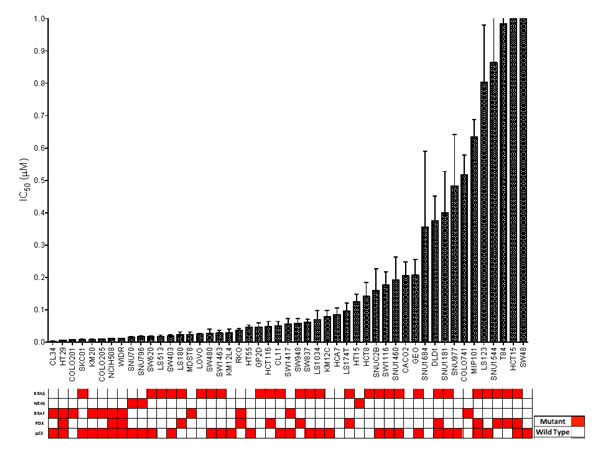 Figure 1: CRC cell lines exposed to TAK-733 to establish their IC50s. Cell lines with an IC50 of > 0.5µM are considered to be resistant. There was a broad range of sensitivity to the agent. Mutant genes are shown in red. Eighty-two percent of sensitive cell lines were BRAF or KRAS mutant (p = 0.03).