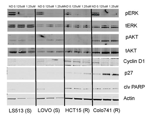 Figure 2: Effect of TAK-733 on downstream effectors. Two sensitive and resistant CRC cell lines were exposed to TAK-733. S and R represent sensitivity or resistance to TAK-733.