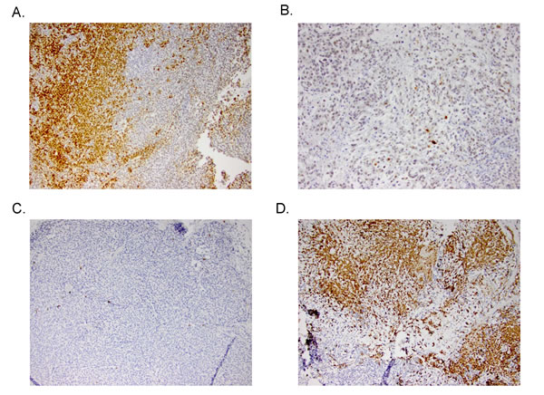 Figure 5: Representative IHC stains of p-ERK in A) control and B) treated PDXs (top) and caspase 3 in control and treated PDXs (bottom).
