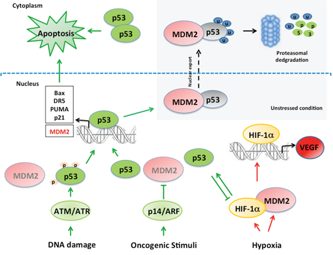 Figure 1: Schematic representation of MDM2/p53 and MDM2/HIF1alpha network. In unstressed conditions p53 expression is kept at very low levels in the cells by the binding with MDM2 and subsequent MDM2-mediated p53 degradation. Several stress conditions such as DNA damage and oncogenic stimuli impair MDM2/p53 binding. DNA damage provokes p53 phosphorylation, preventing the interaction with MDM2 and subsequent p53 stabilization. Oncogenic stimula activate p14/ARF which inhibits MDM2 and prevents p53 degradation. MDM2 is a transcriptional target of p53 creating a negative feedback loop. Hypoxia induces increase of MDM2 and HIF1alpha, a transcription factor implied in VEGF regulation. MDM2/HIF1alpha interaction stabilizes HIF1alpha promoting its transcriptional activity. Activated p53 and HIF1alpha reciprocally modulate their activity. Indeed, HIF1alpha induces p53 activation, while p53 has a negative effect on HIF1alpha expression. MDM2: Mouse Double Minute 2; HIF1alpha: Hypoxia Inducible Factor 1 alpha; VEGF: Vascular Endothelial Growth Factor; ATM: Ataxia-Telengiectasia mutated; ATR: Ataxia Telangiectasia and Rad3-Related Protein.